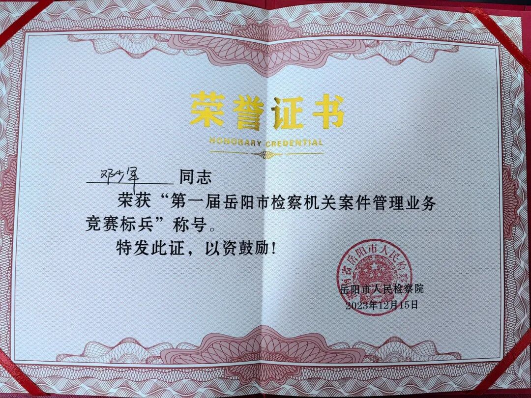 为切实提高全市检察机关案件管理工作水平,加强案件管理能力建设,近日,岳阳市人民检察院举办了第一届全市检察机关案件管理业务竞赛。经过初赛、决赛2天4场的激烈角逐,临湘市人民检察院选派的干警邓少军表现突出,以第三名的好成绩荣获“第一届岳阳市检察机关案件管理业务竞赛标兵”称号。