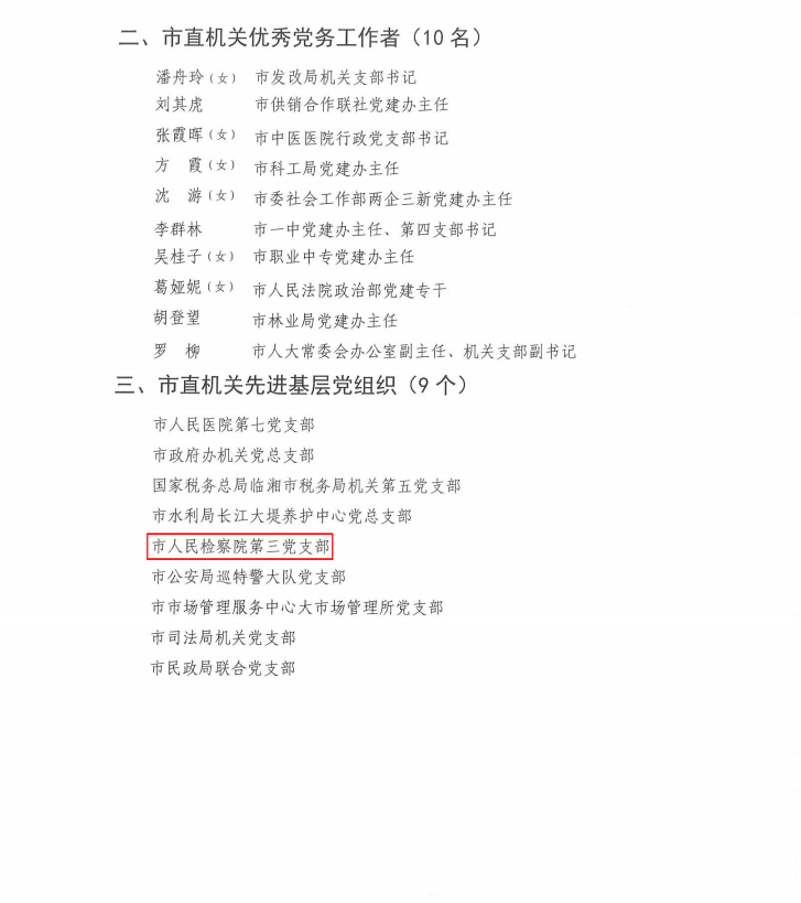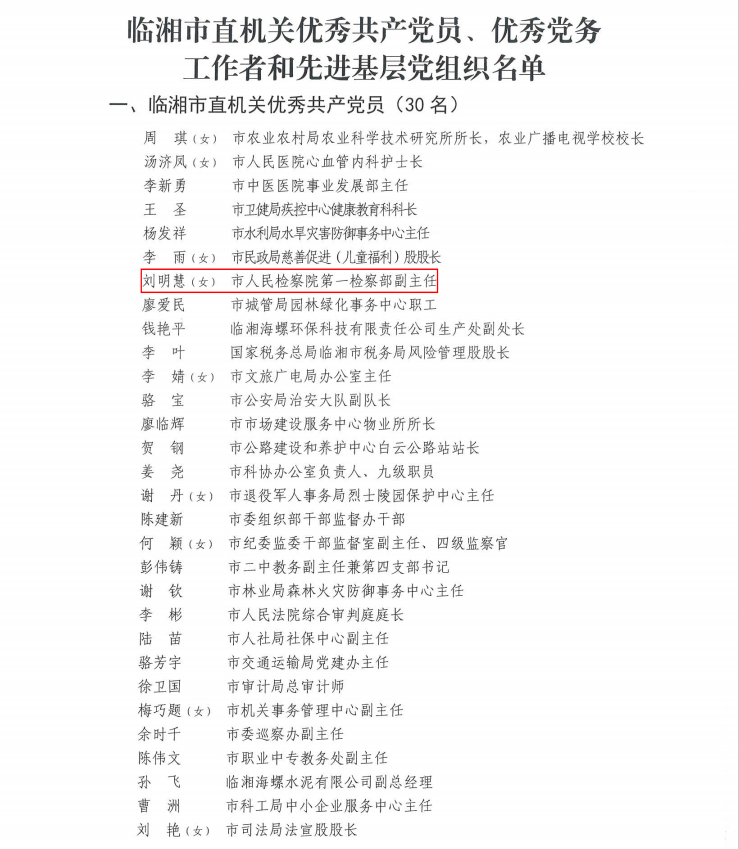 在庆祝中国共产党成立104周年之际,为表彰先进、鼓舞斗志,激励各级党组织和广大党员奋勇争先、建功立业,中共临湘市委组织部、中共临湘市直属机关工作委员会发布《关于表彰临湘市直机关优秀共产党员、优秀党务工作者和先进基层党组织的决定》,其中:临湘市人民检察院刘明慧同志被评为“优秀共产党员”,第三党支部被评为“先进基层党组织”。